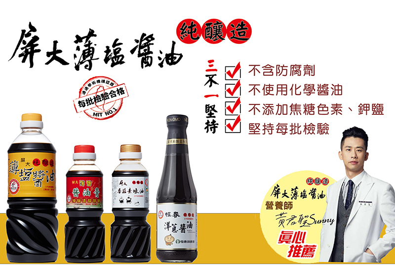 屏科大所研發的薄鹽醬油,特別之處在於它完全不添加「鉀離子」,就是無添加任何代鹽(檸檬酸鈉、蘋果酸鈉、氯化氨、氯化鉀)的成分,市面上許多薄鹽醬油,標榜低鈉食品,通常都是使用代鹽成分,就是以鉀取代鈉的產品,若過度食用將會對腎臟造成負荷。薄鹽醬油」可以做到「低鉀低鈉」,不用防腐劑,又能色香味俱全,比日本貨更勝一籌。 依循ISO22000的規範,並在產品流程中設立完備的監測點,由進料開始到成品每個環節都有嚴格的監控。人員的訓練更是慎重,而且有長期嚴謹的完整養成訓練。由最專業的工作人員在最周詳完備的管理下,提供最優良的產品給消費大眾。