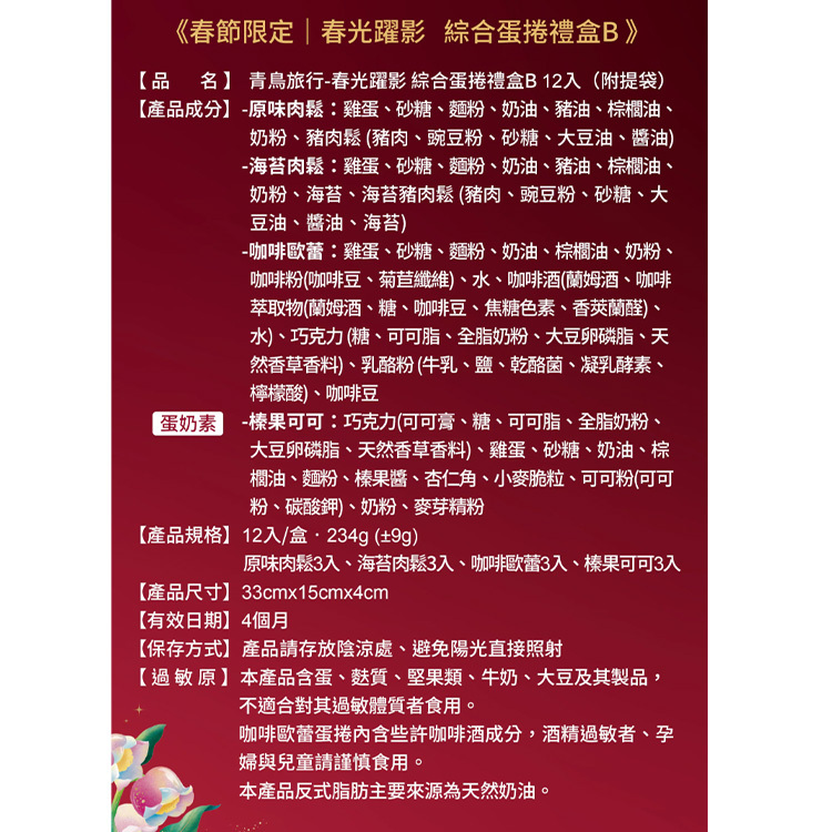 【青鳥旅行】春舞金燦B-綜合蛋捲禮盒12入 (2026新年預訂)