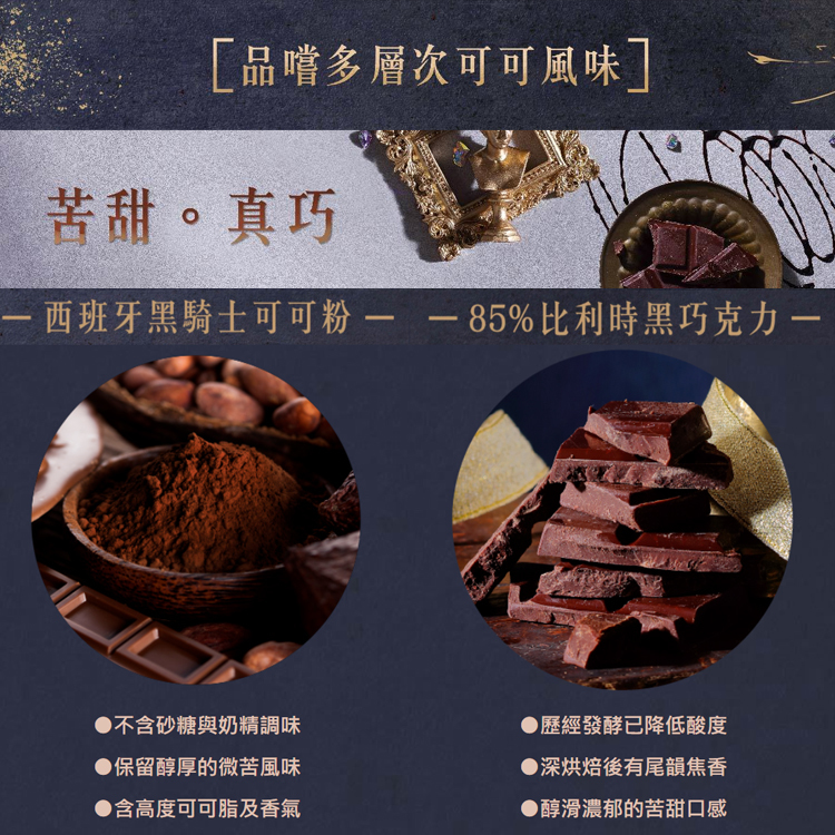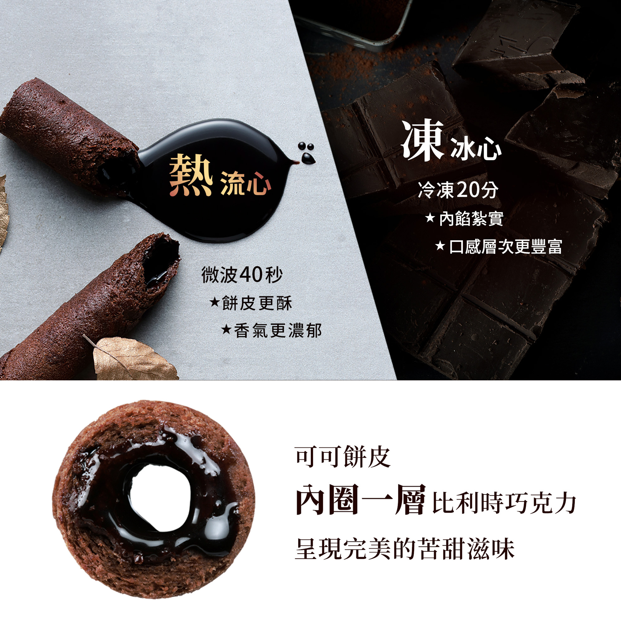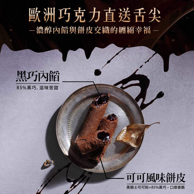 品嘗「醇黑真巧蛋捲」入口時,會先品嚐到帶有巧克力塊的香甜酥脆可可餅皮,透過可可亞醇厚香氣滿足嗅覺感官,再結合真實巧克力的黑巧薄餡,越是咀嚼,越能體會巧克力交織出的完美苦甜滋味,滿足味蕾欲望,為台灣首創、名副其實的「真」巧克力蛋捲
