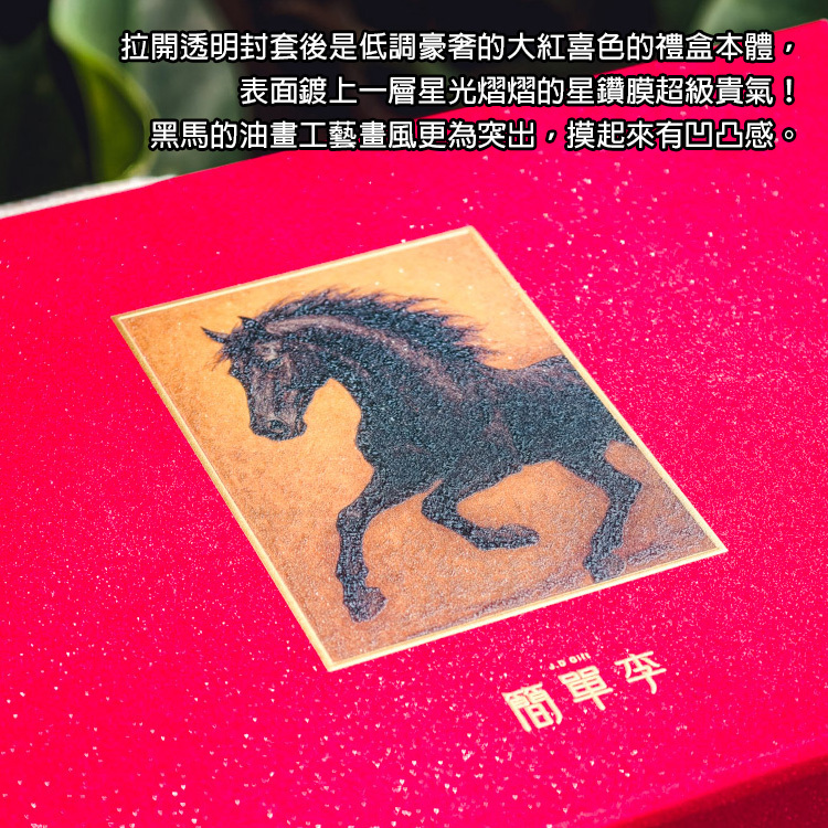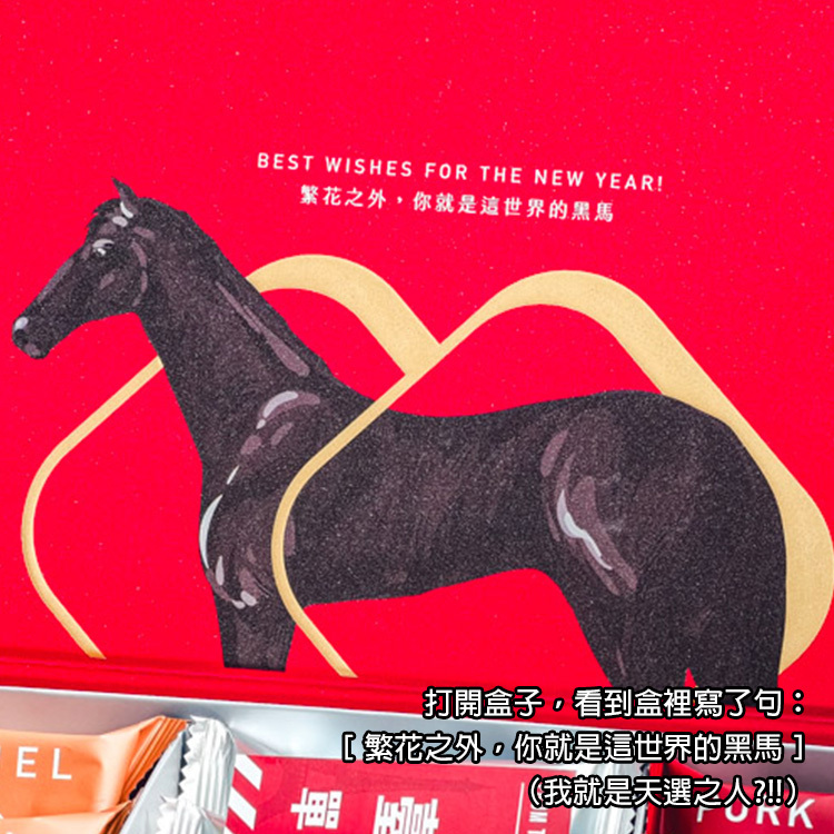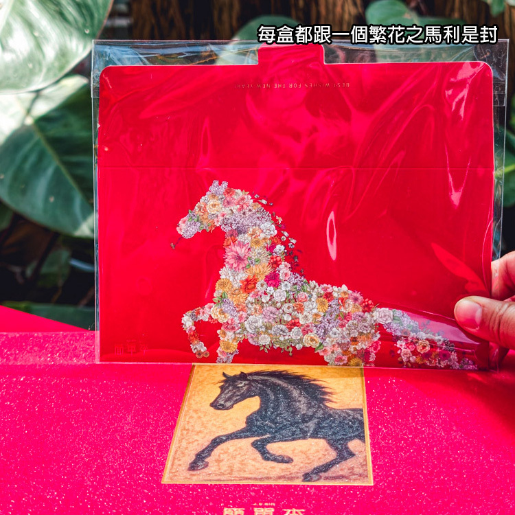 馬年限定禮盒🐴 重磅登場丨以滿版花卉描繪繁花盛放意象,黑馬奔馳於花叢間,隨光影流轉閃爍,象徵「乘勢而上・繁花相伴」。以開心果夾心餅為主角,奢華香濃。搭配焦糖、莓果、芝麻、肉鬆花生等經典風味,為團聚時刻增添祝福與溫度