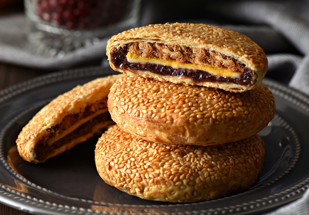 🔪內餡由甜甜的紅豆餡與麻糬➕配搭鹹鹹的肉脯和蛋黃